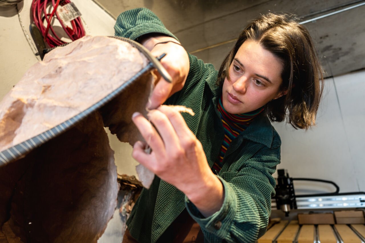 Leah Aegerter is a sculptor who utilises a mix of digital fabrication methods. Her abstract sculptures represent moments and experiences within the landscape. By employing 3D scanning, she reproduces geological surfaces in innovative materials through digital fabrication.